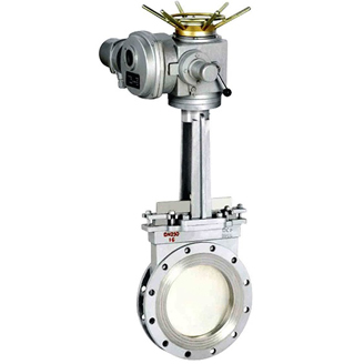 Z973H电动刀型闸阀 Z973H电动刀型闸阀配有多回转式电动装置,使阀板作上下直线运动,实现远程控制阀门的打开或关闭,阀体材质采用铸钢、不锈钢,使用温度:≤425℃,公称压力:1.0~1.6MPa。应用于化工、煤炭、制糖、污水、造纸等领域,特别适合于造纸行业在管道上作调节与节流使用。