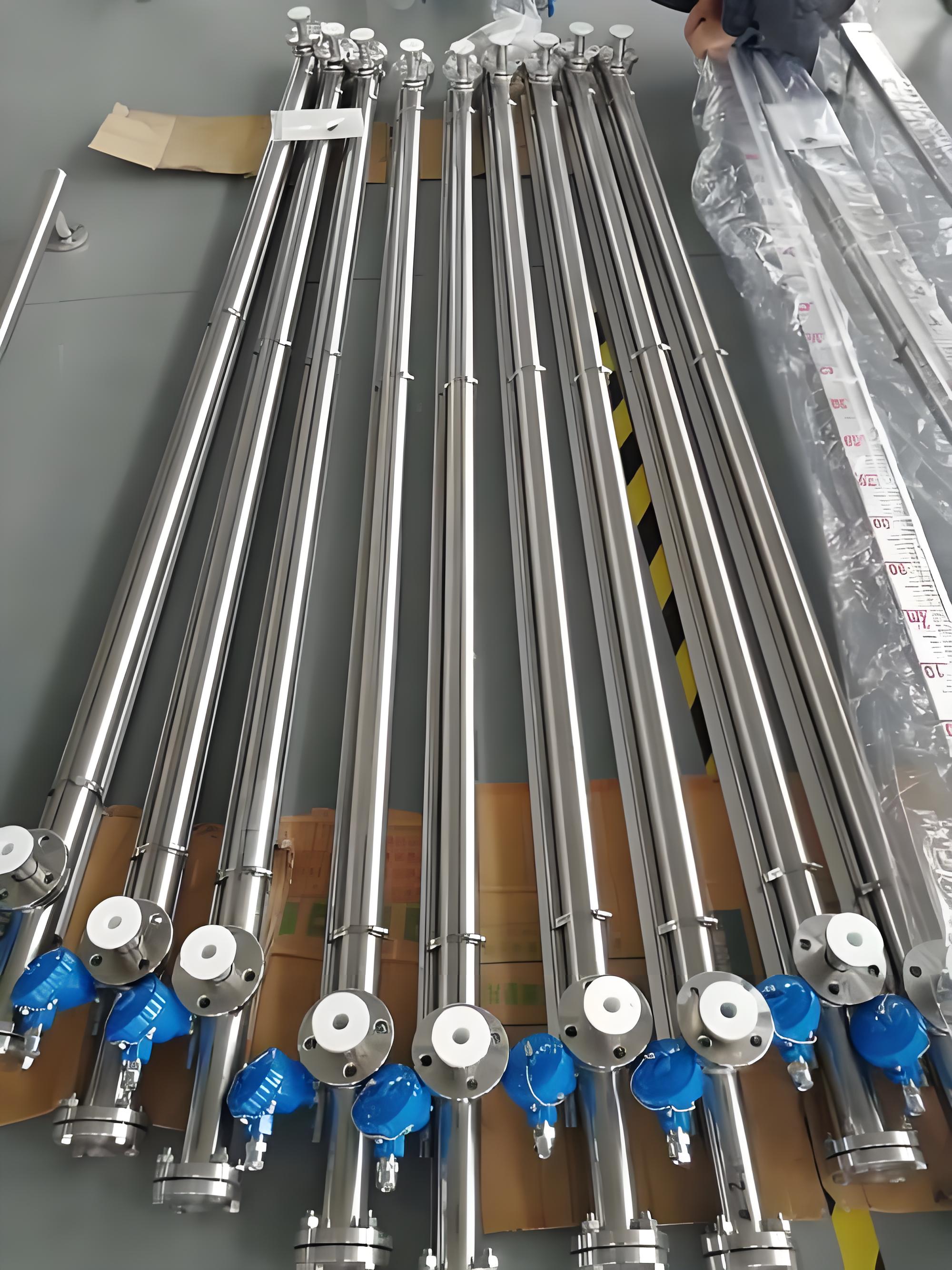 由304不锈钢衬四氟或316L不锈钢衬四氟材料组成的液位计测量时利用磁耦合原理和浮力原理,使液体介质和指示器完全隔离,对易燃、易爆和毒性介质液位检测更加可靠。该液位计指示清晰,观察方便,就地指示形式为红白翻柱。配上 我 公司 生 产 的 DKS-UB,DKS-UHZ57Y 远 传 配套 仪 表 和DKS-XMTA9000数显表,连接至 DCS 或 PLC 系统,则可更方便地实现远距离检测、监控和报警。